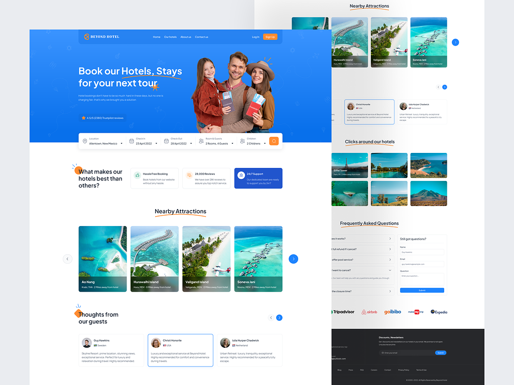 A modern booking website template suitable for hotels, resorts, vacation rentals, serviced apartments, guest houses, travel agencies, tourism platforms, and accommodation booking websites. Designed to manage room listings, availability, booking forms, galleries, guest reviews, nearby attractions, and travel content with a clean and user-friendly layout.