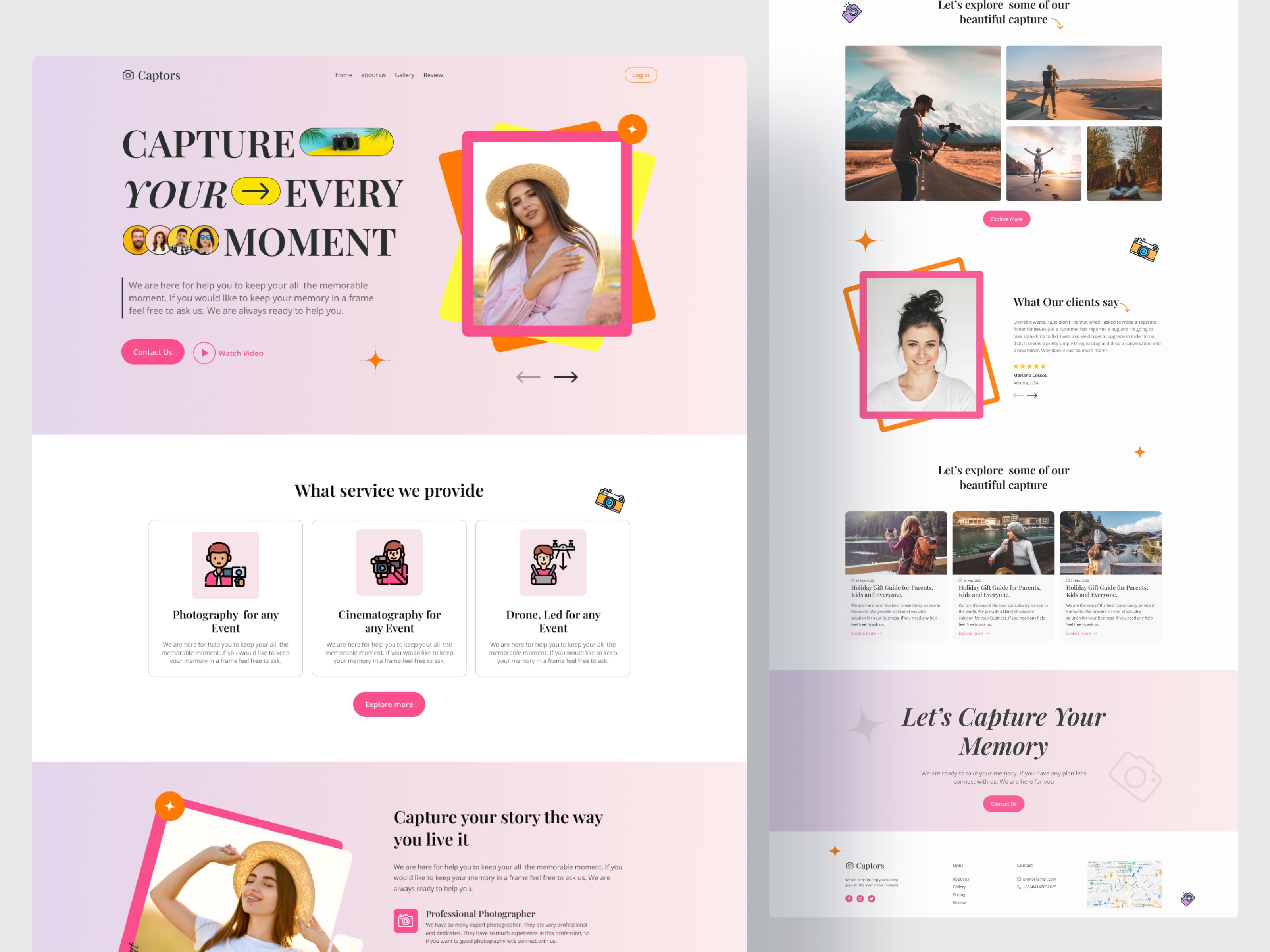 A creative visual website template suitable for photographers, videographers, content creators, media studios, creative agencies, filmmakers, event coverage services, personal brands, and visual professionals. Ideal for showcasing portfolios, galleries, services, client testimonials, featured projects, and contact details with a visually engaging and modern layout